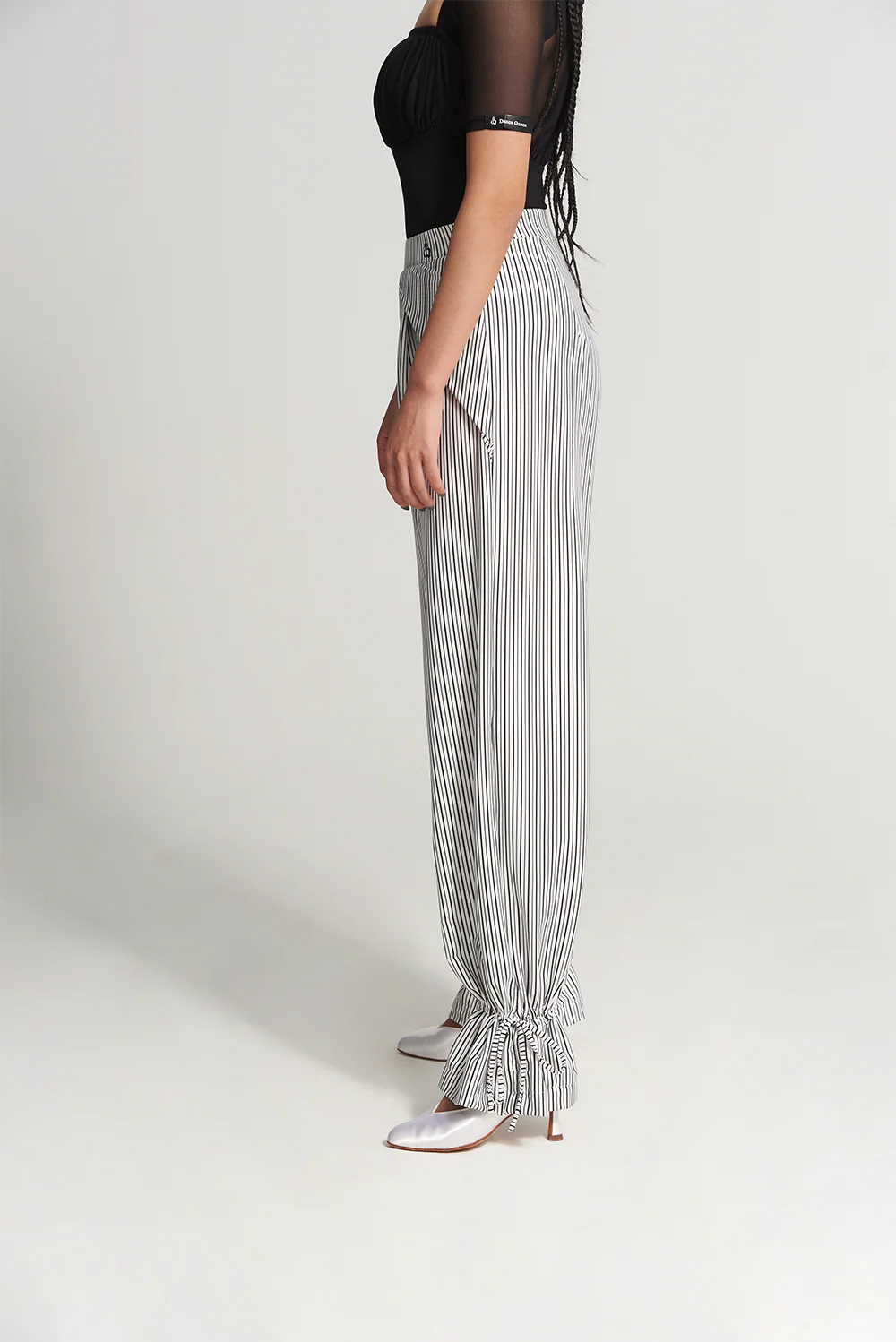 The ruffled design adds a touch of flair to this style, while the black strip provides a slimming and elongating effect.