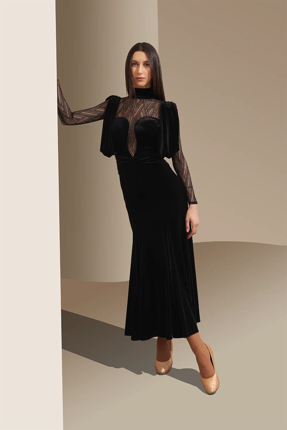 Indulge in the luxurious elegance of our DANCE QUEEN 855 Autumn Plum Lace Gloves Custom Made Ballroom Dress. Featuring a high neck and backless design, this velvet dress exudes sophistication and grace. The black lace long sleeves add a touch of charming femininity, making it the perfect choice for practice or show.