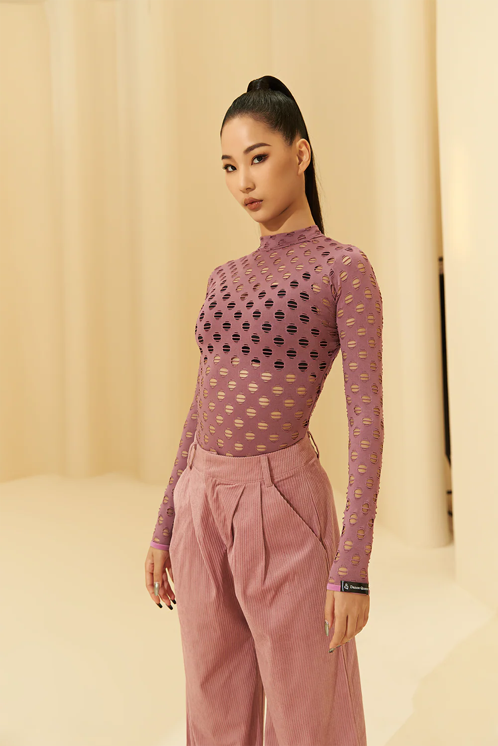 This DQ 620 leotard features a high neck and unique hollow design, perfect for dancers of any level. Its pink color adds a touch of femininity to your performance. Stay comfortable and stylish with this leotard.